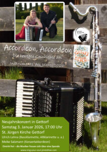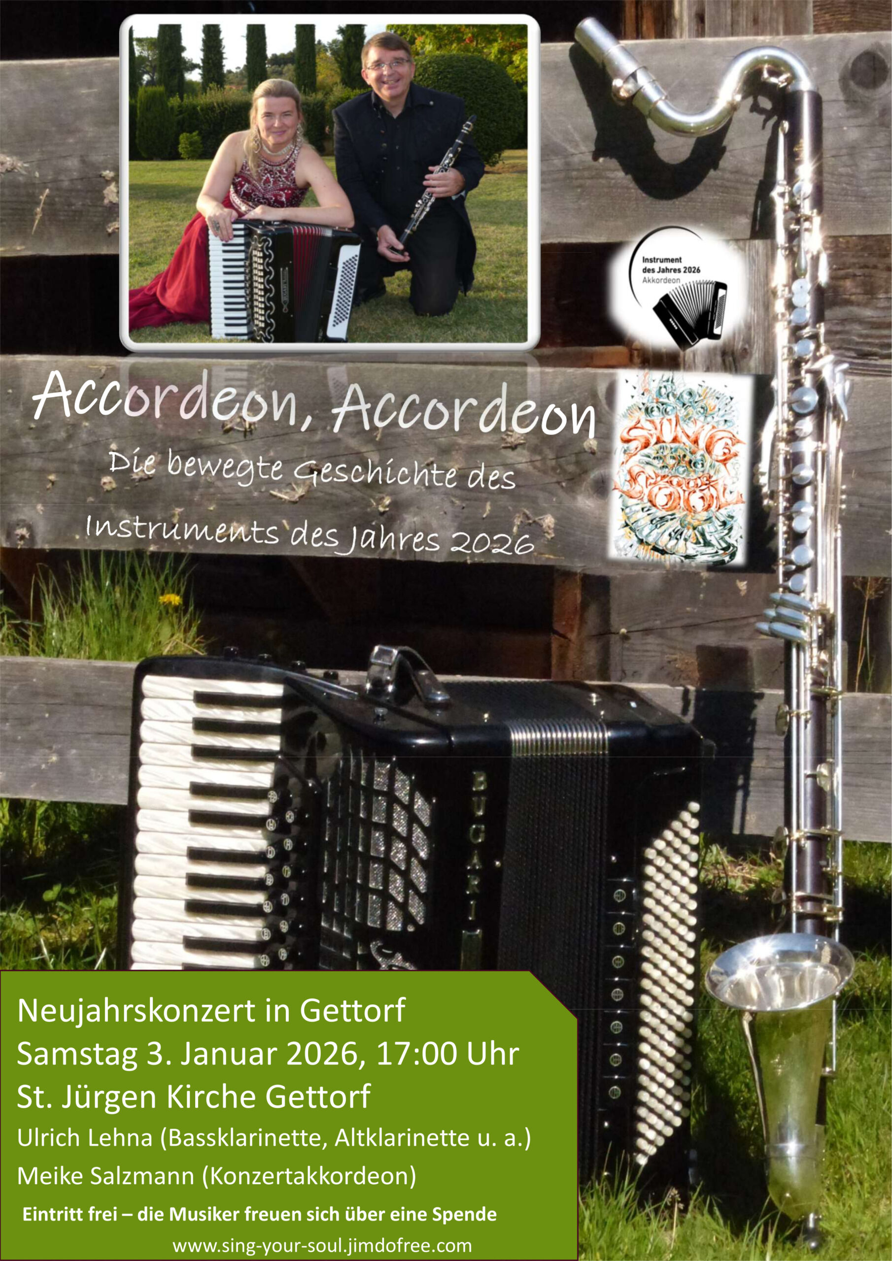 „Accordeon, Accordeon – die bewegte Geschichte des Instruments des Jahres – ein Traum von Heimat und Meer, von Frieden und Freiheit“ ist das neue Programm des Duos „Sing Your Soul“ anlässlich der Kürung des Akkordeons zum „Instrument des Jahres 2026“. Am Samstag 3. Januar um 17 Uhr präsentieren Meike Salzmann und Ulrich Lehna ein verblüffend vielseitiges Klangspektrum mit verschiedenen Akkordeons und Klarinetten in der schönen St. Jürgen Kirche in Gettorf.