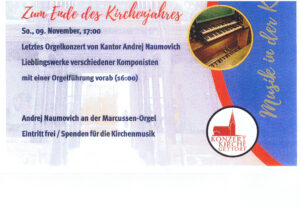 Doch bevor das neue Kirchenjahr mit dem ersten Advent beginnt, möchte ich Sie zu folgenden musikalischen Veranstaltungen einladen!
